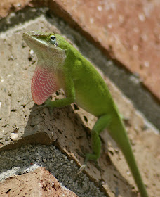 "What the heck is that lizard doing?" It was the first time I'd ever seen a lizard puff out his pouch (that I now know is called a dewlap) and I was shocked. I didn't know that our friendly little green buddies did that. So I looked it up. Obviously, I had not been very observant over the years, or maybe they had never felt safe enough around me to strut and do their push-ups and puff their dewlap while I was around, but this one was bold and brave and, frankly, a bit brazen. They puff that thing out there as courtship ritual. He could have just been trying to tell us to get lost. It's a territorial thing too.