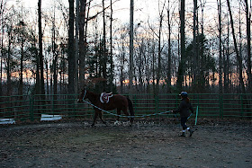 I feel friskier than usual (I want to set off doing cartwheels across the lawn), the dogs feel friskier (Buzz runs around like a crazy man), Roo feels friskier, and he has to be ridden down more or lunged to get out some of that excess energy. Here's Elizabeth lunging Roo. Now she's the only one riding him.